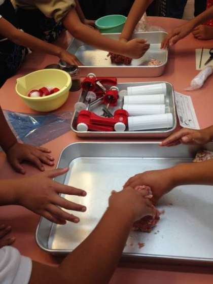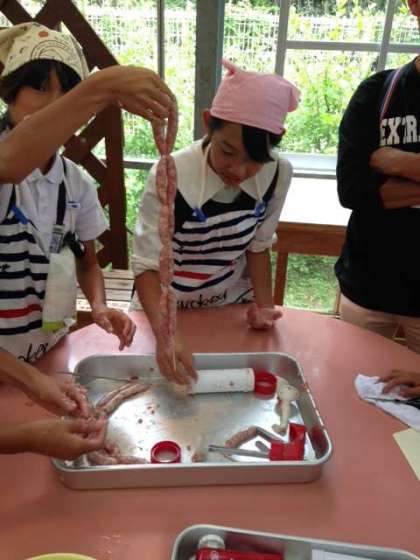 みんなで説明を聞きながら、ウインナー作りに挑戦しました!