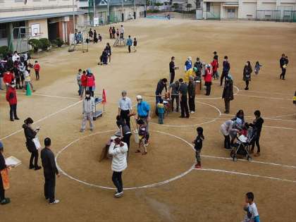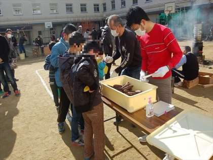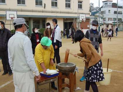 12月11日(日)10時から小学校の校庭で「親子でもちつき大会」を開催しました。朝早くからPTA・地域のボランティアの皆様の手際よい準備のおかげで、子どもたちはあつあつのお餅と焼き芋をおいしそうに食べていました。就学前の小さな子から大人まで、協力してついたお餅は最高の出来栄えでした。毎年伝統的に行われている「もちつき」をすることで、子どもが高齢者および地域の人たちとの交流ができ、より一層絆を深め合うよい機会となりました。