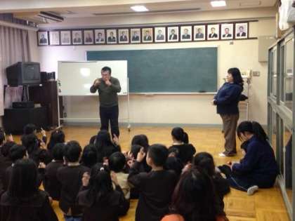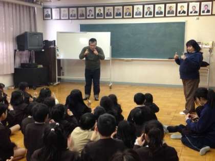 19日、2年生が、講師の先生にお越しいただき、手話の勉強をしました。