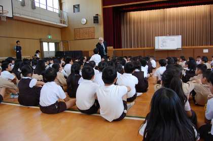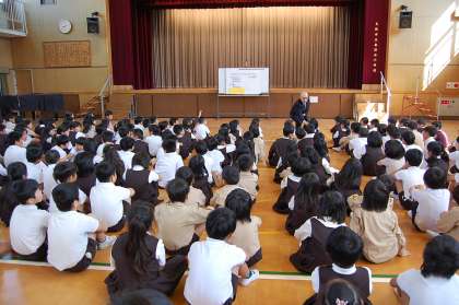 校長先生の話に耳を傾ける春日出っ子・・・。問いかけに手を挙げて答えよう、考えようとする春日出っ子・・・。