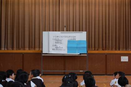 そんな中、今日は『いじめについて考える日』。児童朝会を講堂で行いました。