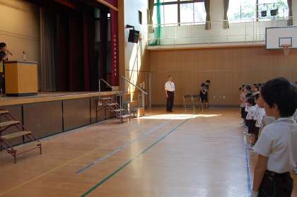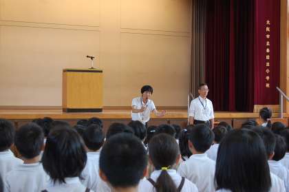まず、児童の登校の様子を見守っていただき、その後、朝会で此花区として子どもたちにがんばってもらいたいことの話をしていただきました。
