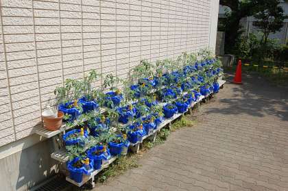 一年生のあさがおの向かい、講堂入口奥にも大切に2年生が育てているプチトマトを発見!ずいぶんと大きくなりました。この時期の植物はずいぶんと育ちが早いです!