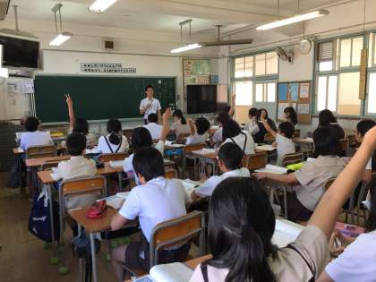 先生の発問に答えようと懸命に手を挙げる六年生。