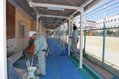 過日お伝えしました給食室前の廊下の屋根とそれを支えている柱のペンキの塗り替え工事ですが、天候にも恵まれて順調に進んでいます。