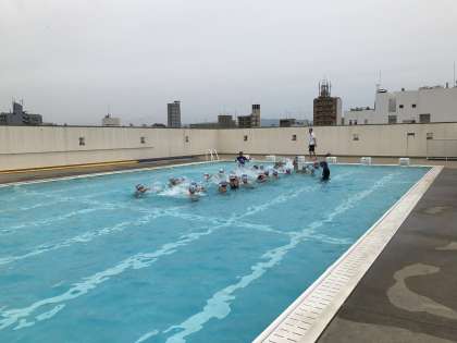 講堂で準備運動を入念に行い、プール水泳のルールを確認した後、いよいよ屋上プールへ・・・。もう少し、お日様が欲しかったですが、湿度が高かったので水の中は心地よかったようです。