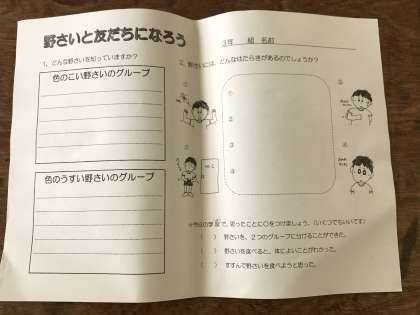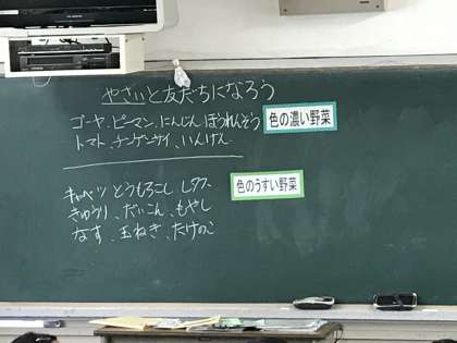 グループで話し合って、写真のような意見が出されました。色の濃い野菜とうすい野菜に分かれました。どちらの野菜とも友だちになりたいですね。