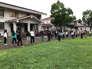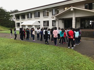 二日目の朝です。全員時刻に遅れることなく、朝の集いを行いました。少し肌寒いです。