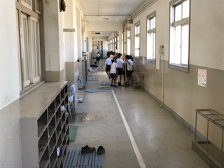 恒例の校内清掃です。大変暑い中ですが、子どもたちも先生も、そしてお手伝いくださっている保護者の皆さんも日頃行き届かない所を協力して掃除することができました。