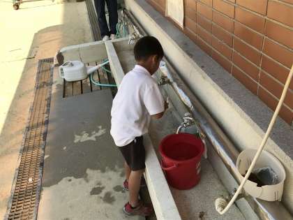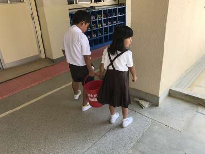 そんな中でも、通常の学校生活が始まっています。掃除ができているか様子をうかがうと、なんと1年生もこんなに頑張っているのを発見しました。防火バケツを協力して運んだり、最後まで自分の仕事として水を入れ替えてくれたり…。