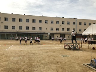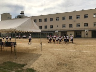 運動場いっぱいに子どもたちが広がっています。曲に合わせて元気に踊ります!