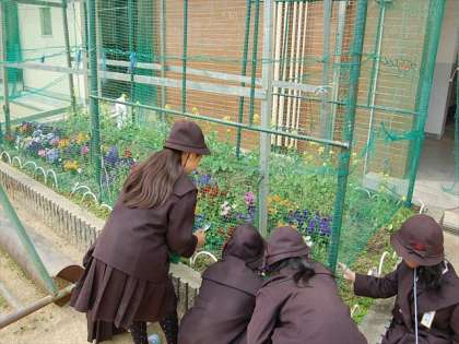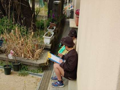 校庭では3年生が、春の自然を観察していました。探検ボードやむしめがねを持って、真剣に観察していました。