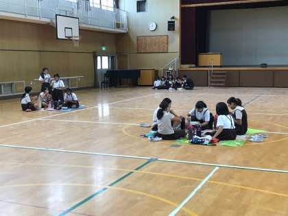 雨がうらめしいですね。本当は奈良公園で昼食だった五年生です。23日に延期になってしまった遠足です。それでも、気分を変えて講堂で仲間と食べる弁当は格別です!次こそ絶対遠足に行きたいですね。お家の皆さん、また大変だけど弁当作ってください。よろしくお願いします!
