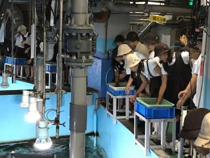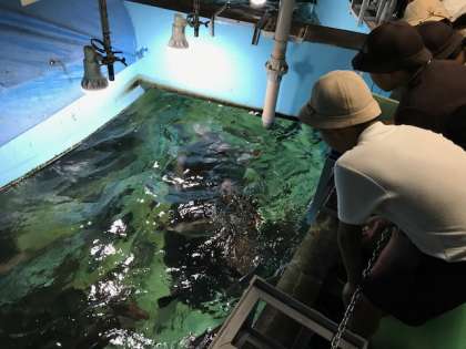 こちらはエサやり体験です!タイ、カンパチ、ブリ、サメなど元気に泳いでいます。すごい勢いでエサに食いついてきます。