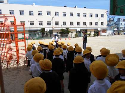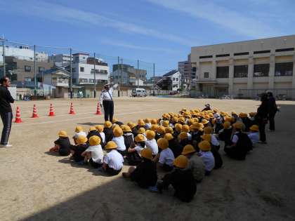 今日は、2時間目に1年生といっしょに交通安全教育を行いました。此花警察の方々から、道路を渡る際には左右の安全を確認すること、飛び出さないこと、信号の青や黄色の本当の意味など、子どもたちが安全にすごすために大切なことをたくさん教えていただきました。