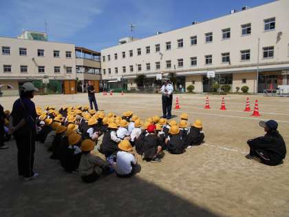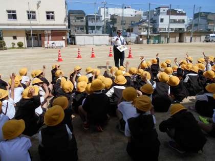此花警察の方々から、安全に道路を渡るときにはどんなことが大切なのか、お話や見本を見せていただきながら学習しました。道路を渡る練習では、少し緊張しながらも先生や警察の方々の指示をしっかりと聞きながら、がんばって行うことができました。