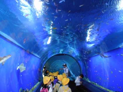 なが〜いエスカレーターをのぼり、水のトンネルをくぐってわくわくどきどきの海の世界の始まりです!!