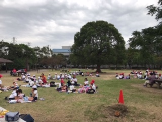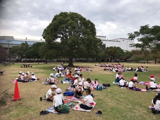 遠足で食べるお弁当は最高においしいです。笑顔あふれる時間です。