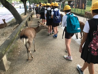 遠足、修学旅行などの観光客でいっぱいです。鹿もさっそくお出迎えです。