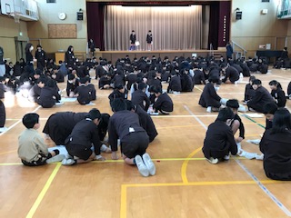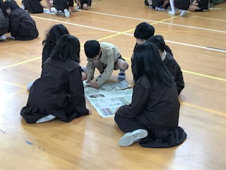 今日の児童集会は、新聞紙をたてわり班で協力して長くちぎっていくゲームを行いました。フリーハンドで細く、長くちぎる。意外と難しかったですね。