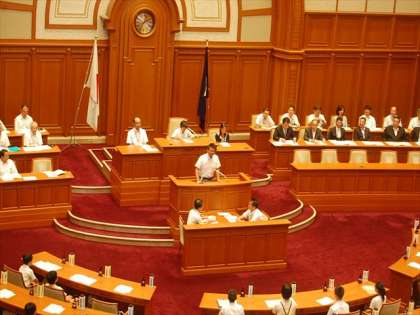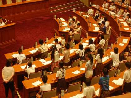 実際に大阪市議会として使われている、大阪市役所の市会本会議場の議席に座り「未来のおおさか」を創造するべく素晴らしい意見を述べることができました。