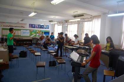 この写真は、みんなで合奏指導について学びあっている様子です。