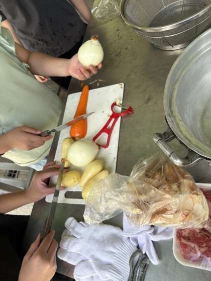 昨日の食材探しでゲットした食材で、カレーを作っています。