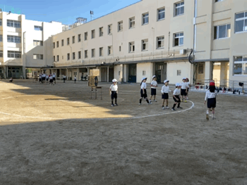 1年生の体育では、2チームに分かれて、真ん中に置いてある的にボールをあてる運動を...