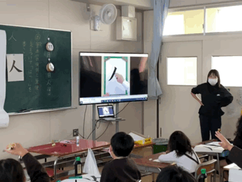 3年生では、習字の授業中です。 「人」を書きます。はらい方が難しいー。墨のつけ方...