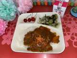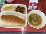 今日の給食は、鶏肉のカレーマヨネーズ焼き、てぼ豆のスープ、三度豆とコーンのサラダ...