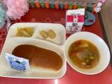 今日の給食は、カレードリア、豚肉とキャベツのスープ、りんごです。 パンはさつまい...
