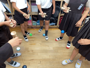 休み時間に、教室で6年生の子どもたちがけん玉をしていました。思い思いの技に挑戦し...
