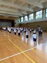 1年生が、講堂で体育の授業を行いました。今日は、準備体操、メインの「跳躍」の活...