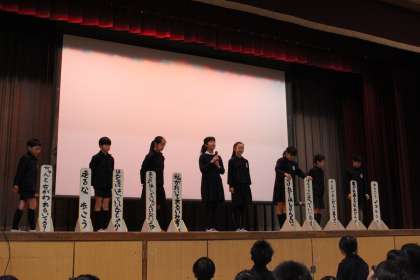 児童会の取り組み「右側歩行運動」の一環で、これまで使用していた立て看板をリニューアルし、児童集会時に全校児童に披露しました。書かれてある標語は、各学級で考えた標語です。