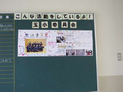 学校掲示板の「玉小委員会」のコーナーでは、各委員会の活動を順に紹介しています。今は、放送委員会の活動を紹介しています。