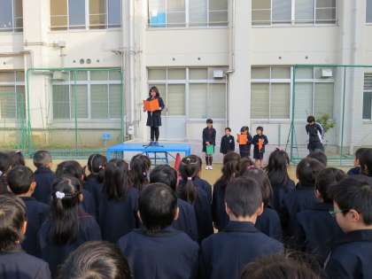 12月25日(木)二学期の終業式を行いました。今回の終業式は講堂が天井工事中のため運動場で行いました。校長先生のお話の後、2・5年の児童5名が二学期を振り返ってがんばったことの発表をしました。その後、生活指導担当の先生から冬休みの生活の話として見知らぬ人や自動車に対する注意喚起をしました。
