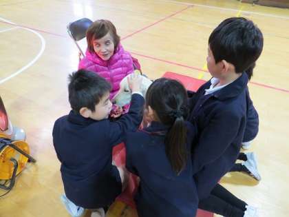 2月3日(火)3年の「見えないってどういうこと」の学習で、ゲストティーチャーとしてNPO法人ヒューマンライフサポートの山本美恵子さんと盲導犬のフェリシアを招きました。山本さんからは、子どもの頃のお話や、水泳やバレーボールなどいろいろなスポーツにチャレンジしてきたこと、日常生活での様子、そして盲導犬がいかに大切なパートナーであるか、さらに周りの人のサポートの大切さなどのお話を聞きました。その後、目の不自由な方が音を頼りにプレイするサウンドテーブルテニスの体験や盲導犬とのふれあいを行いました。