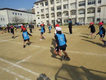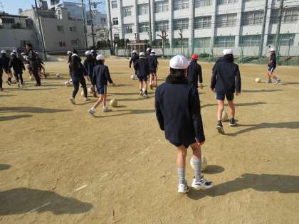 2月10日(火)5,6年は「トップアスリート夢授業」としてJリーグのセレッソ大阪から4人のコーチを招き、サッカーの授業をしていただきました。初めの基礎練習から工夫された内容で子どもたちは楽しく練習ができました。後半のゲーム形式の練習では各チームにコーチが1人入り、アドバイスをもらうことで子どもたちの動きは大きく変わりました。2時間という短い授業でしたが有意義な時間でした。