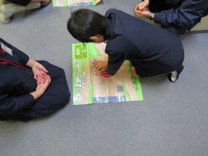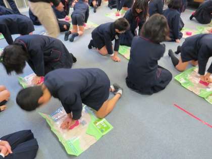 写真は6年の「救命講習(ジュニア パラメディック訓練)」です。