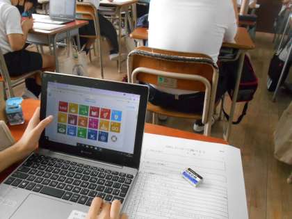 5年生は、総合的な学習の時間に、一人一台の端末で「SDGs」とは何か調べ、レポートにまとめています。世界に目を向け、自分たちが生きる未来について深く考える力を身に付けてほしいと思います。