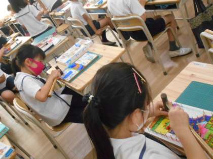 3年生は、金づちを使って釘を打ち、釘にゴムをかけ、ビー玉転がしゲームを作成しています。初めての金づち。釘を抑えながら慎重に使っています。出来上がった作品で遊ぶのが楽しみですね。