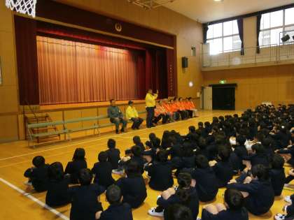 登下校時に児童の安全を見守ってくださっている「玉造セーフティネット・子ども安全指導員・中央区役所ゆめまるパトロール隊」の方々に児童から日頃の感謝の気持ちをこめて、歌や感謝の言葉を贈りました。
