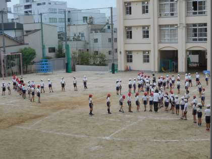 昨日、4年生は、運動場で、団体演技の隊形移動の練習をしました。