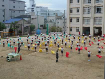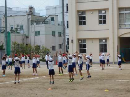 感染対策のため、どの学年も、十分な間隔をとり運動場いっぱいに広がって演技をしています。触れ合う動作や声を出す演出は、しないようにしています。