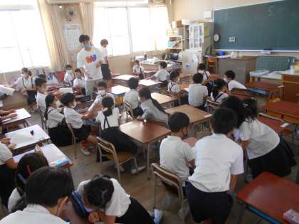 たてわり班ごとに教室に分かれ、スポーツビンゴとお菓子ビンゴをしました。集会委員が放送で呼びかけ、ゲームを進めます。教室では、たてわり班の高学年がグループの友達に優しく声をかけ、和やかにゲームを楽しんでいました。