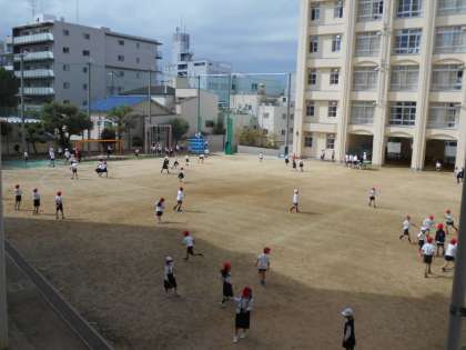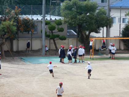 柿の木は運動場の端にあります。鈴なりに実をつけ、子どもたちを見守っています。