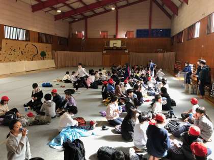 鉢伏山から全員、無事故で下山しました。体育館でスポーツドリンクを飲んでひと息…。