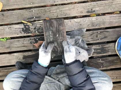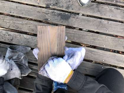「焼き板作り」焼いた板のすすをタオルでこすっていくと、独特の風合が出てきます。この後、ペンキで字やイラストを入れていきます。