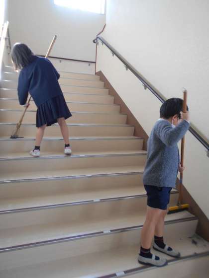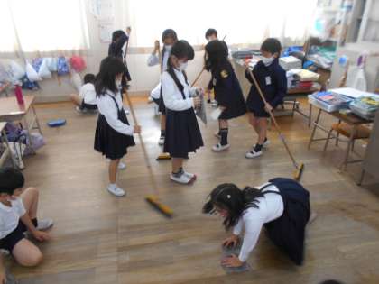 環境委員会の児童が、「清掃用具を正しく使い、みんなで協力してすみずみまできれいにしましょう。後片付けもきちんとしましょう。」と放送で呼びかけました。