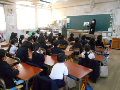 水曜日の朝の15分間、ボランティアグループ「ママのほんだな」のみなさんに絵本の読み聞かせをしていただきます。